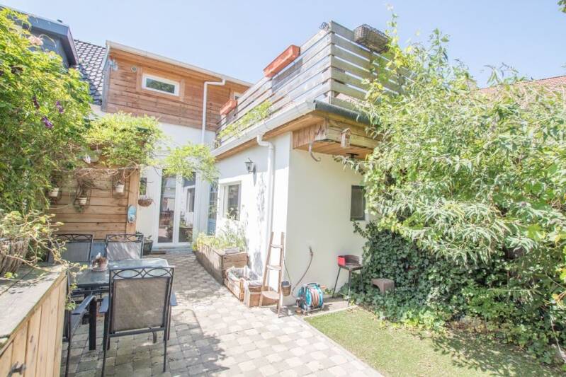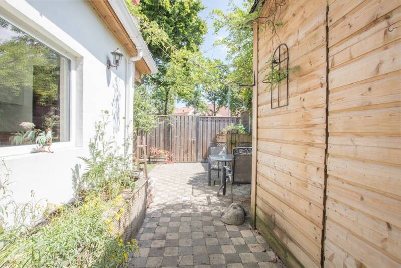 De tuin is zongericht, heeft een berging en een vrij achterom.